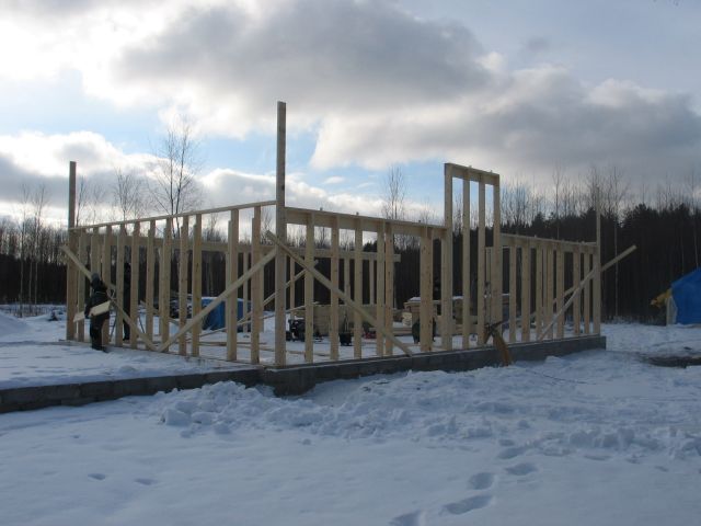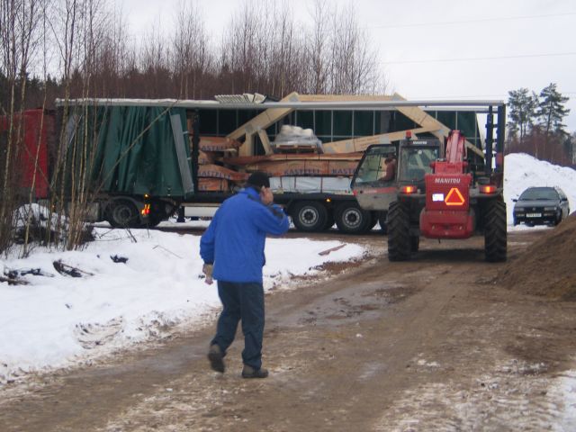 Maja ise toodi kohale rekkaga. Püstitaja tellis ühe upitaja, millega kõik maha tõsteti. Rekkaga toodi kohale kogu maja puitmaterjal (teise korruse fermid, karkassimaterjal, alusvöö, roovitus jpm), välisseinas olev tuuletõkke kipsplaat ning aurutõkke - ja katusekile. Soojustus ja aknad-uksed tuuakse kohale hiljem: