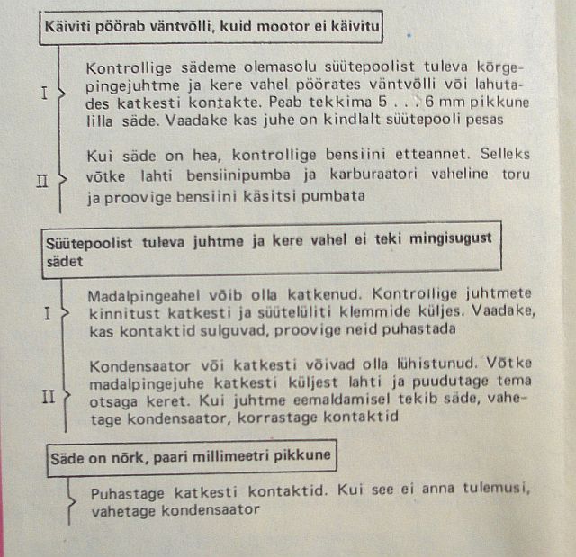 asetad kõrgepingejuhtme tagasi jagaja kaane sisse ja kaane kohale, siis võtad kyynlajuhtme ja asetad samuti kerest ca8 mm kaugusele ja taas starterit. kui nyyd sädet pole siis rootor , või jagaja kaan peetis.