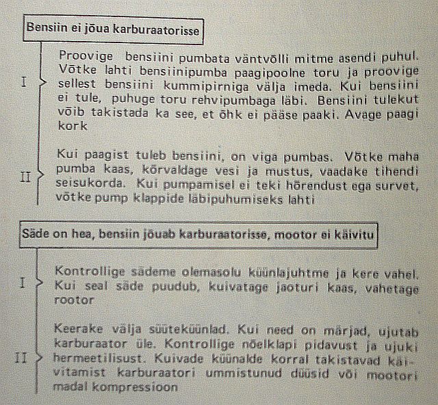 Eile pärast bensiinifiltri vahetust sai Tupsule (900i 84.a) hääled sisse löödud - nii minuti jagu käis ja suri siis välja. Edasised käivituskatsed eile õhtul ja täna hommikul ei andnud miskeid tulemusi - isegi ei lubanud. Vahepeal puhastasime igaks juhuks küünlad ja käisin pilguga kõik vaakumvoolikud üle ja katsusin üle ka süütejuhtmete kontaktid. Aga hetkel ei oska ta-ga miskit enam teha - tuleb ilmselt paela otsa võtta ja tohtrihärrale näha viia :(