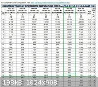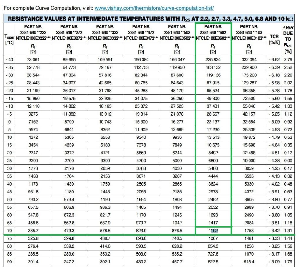 Ja vaadates kiirelt tabeleid ja võttes 70C ja 1000 ohms tõepähe, siis kõige lähemal tundus olevat 6,8k ohmine NTC takisti.