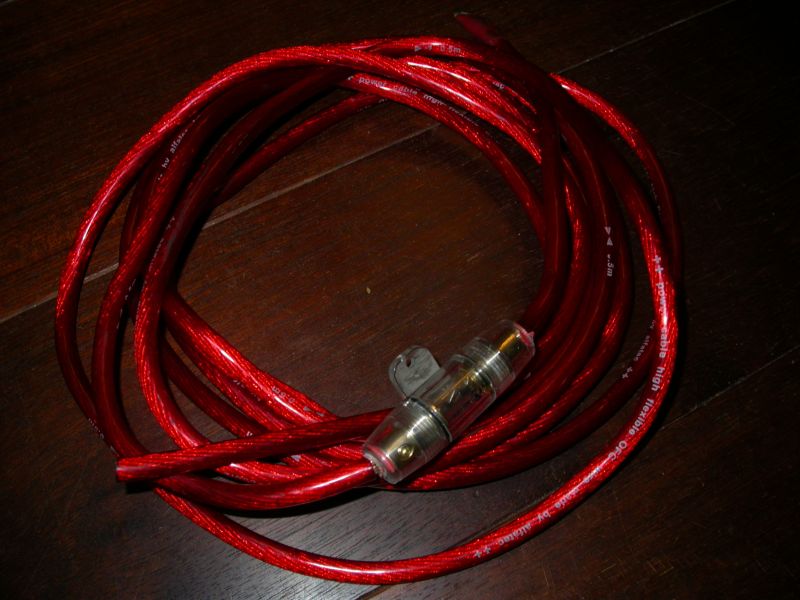Tegu kvaliteetse elektrikaabliga, mis sobilik just autos võimsale helivõimendile toitejuhtmeks. Pikkus 5.1m, täpselt ulatub tonnisel aku juurest pakiruumi. Vasksüdamiku läbimõõt umbes 5 mm, koos isolatsiooniga 9-10 mm. Kaablil kirjad " power cable high flexible OFC made by alfatec". Ühes otsas kaabliking ja sellest 20cm edasi kaitsmekorpus koos terve 60A kaitsmega. Kaal 1.2 kg.