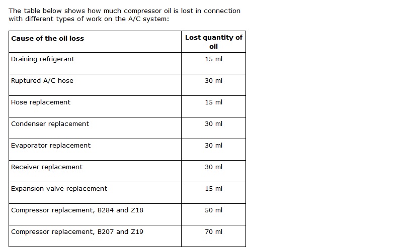 Leidsin muidu WIS-ist põneva tabeli kus on õli kogused märgitud palju võiks kaduma minna mingite komponentide vahetusega. Kogu süsteemis on diislil ja b207-l 135ml. Näiteks uus kompressor tuleb 135ml täidetul kujul. s.t kui ainult kompressori vahetad siis tuleks sealt osa õli välja võtta.