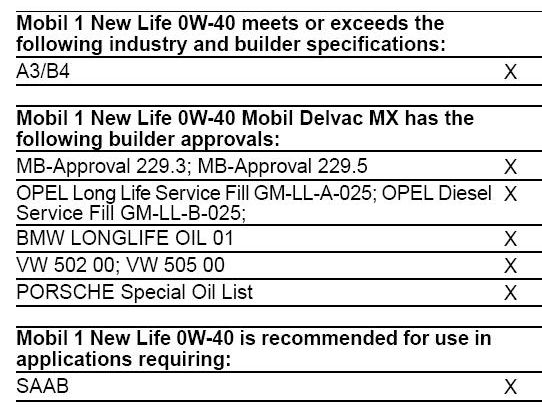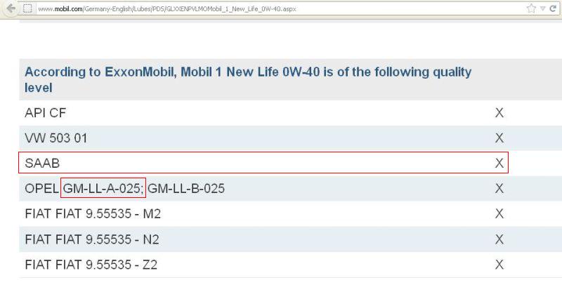 Edit: (9.06.2012) Vaatasin Mobil 1 New Life õli kohta sobilikust ja andmeid ka veel lehelt www.mobil.com ja tegin sellest ühe print screeni. Tõmbasin punasega jooned ümber kus on välja toodud õli sobilikus Saabile.