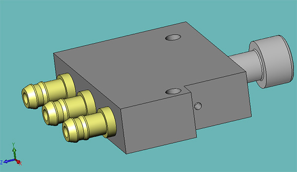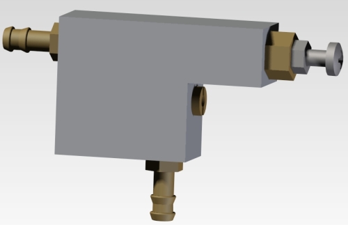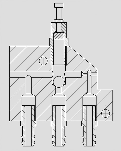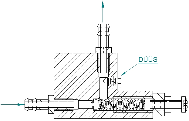Siin on minu klapi ristlõige. Puudu on tehnilistel põhjustel kõik keermed ja vedru (pressib kuuli). Horisontaalse kanali otstes on pimedad M3 ja M5. Peene kanali läbimõõt on 0,6mm.