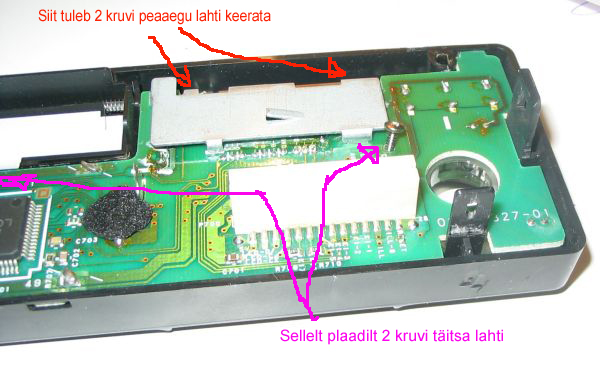 Nüüd tuleb trükkplaat esipaneeli korpusest kätte saada. Selleks keera lahti 2 trükkplaadi kruvi (pildil lillakaspunased nooled) ja peaaegu lahti eemaldatava klahvistiku vabastusmehhanism (pildil näitavad punased nooled kruvide liikaudset asukohta). Viimase võid loomulikult ka täiesti lahti keerata, kuid otsest vajadust pole.