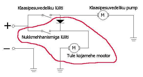 Kojamehe mootoris on sellise huvitava nukkmehhanismiga lüliti, et andes ühele juhtmele korraks pinget, tõmmatakse mootor korraks käima ning nukk sõidab lüliti kontaktid kokku. Ning siis saab mootor toidet juba sellelt juhtmelt millele kogu aeg pinge peale tuleb. Pärast viit tsüklit lükkab nukk jälle kontaktid lahti ja kojamees jääb seisma. Kahtlustan, et sinna juhtmele, kuhu lülitamise ajal pinget antakse, on pinge peale jäänud. See selgitab ka klaasipesuvedeliku pumba pidevat töötamist.
